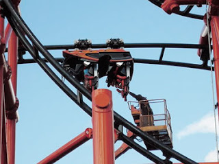 NORTHALLERTON, Britain - Dua orang duduk dalam keadaan terbalik selama 20 minit apabila rollercoaster yang mereka naiki terhenti dengan tiba-tiba kerana masalah mekanikal, lapor sebuah akhbar semalam.